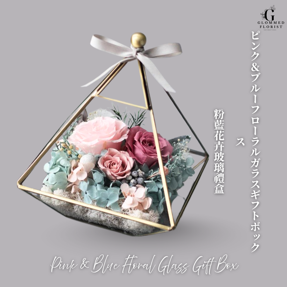 粉色與藍色花卉在金字塔玻璃盒中相映成趣,清新優雅,是送禮的理想選擇。